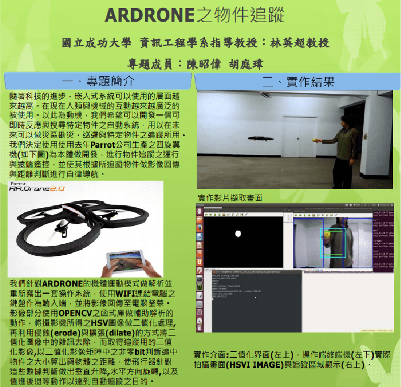 在電影三個傻瓜中,男主角將別人不要的四旋翼飛行機(Quad Roter) 修復而能正常運作,並且配合機上的攝影鏡頭,而可以看到許多正常人不能看到的畫面(如穿得很少在讀書:D)等,令人印象深刻。本專題主要是操控四旋翼飛行機,配合攝影機來進行開發,並設計一些應用。如對本專題有興趣,請連絡林英超老師iclin@mail.ncku.edu.tw