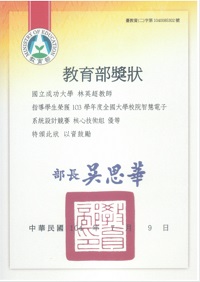 2015Jul 09全國 IE設計競賽優等學生林弋喬、林承謙、呂怡欣、林敬倫獲得教育部全國大學校院智慧電子系統(IE) 設計競賽 核心技術組 優等,成績領先交通大學隊伍