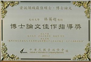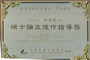 2015Dec資訊學會論文奬 佳作指導學生吳柏勳 榮獲中華民國資訊學會 2015 最佳博士論文獎 佳作