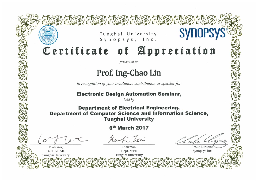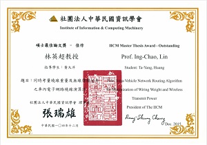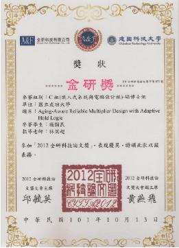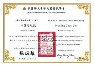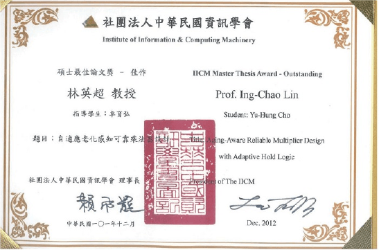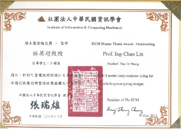 2013Oct 13IICM 碩士論文奬學生王耀德論文:針對可靠電源閘控設計之考慮偏壓不穩定效應的調整睡眠電晶體尺寸演算法 榮獲2013中華民國資訊學會最佳碩博士論文獎 佳作