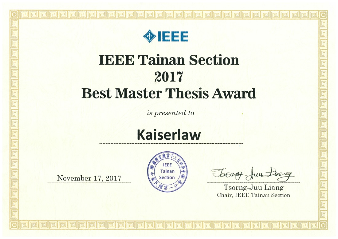 2017Nov 17獲得IEEE Tainan Section Best Master Thesis Award