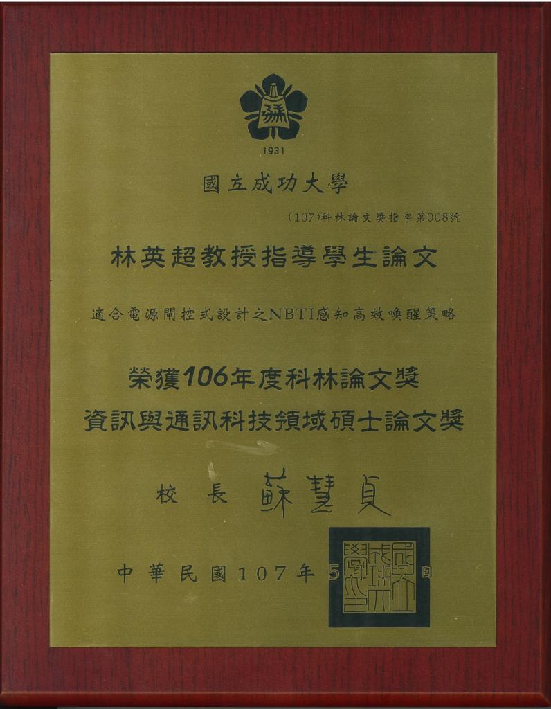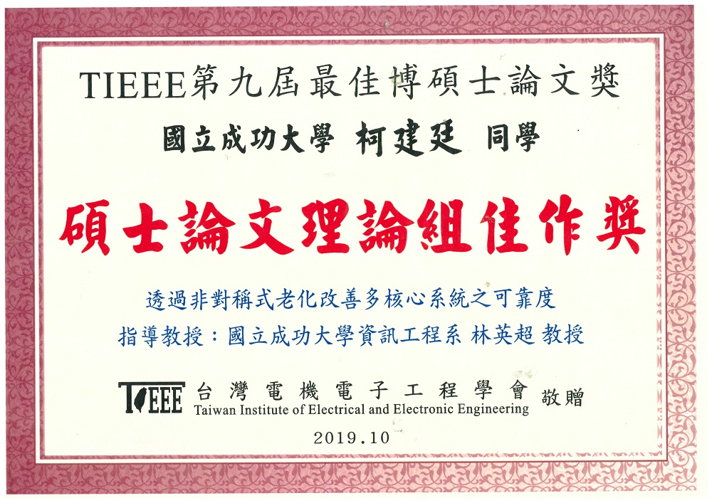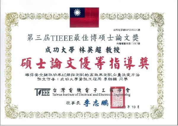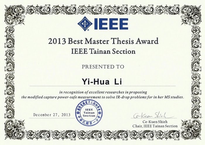 2014Sep 13IEEE Tainan 最佳論文學生裘証年獲得IEEE Tainan Section 2014 Best Master Thesis Award (最佳碩士論文奬)