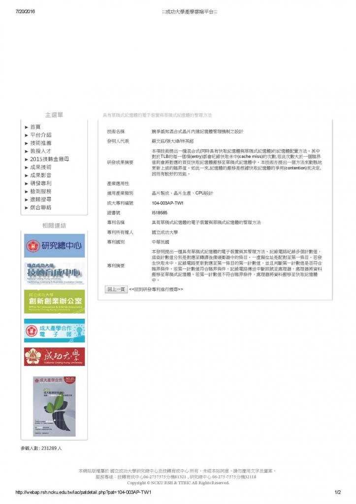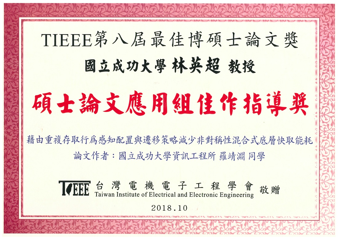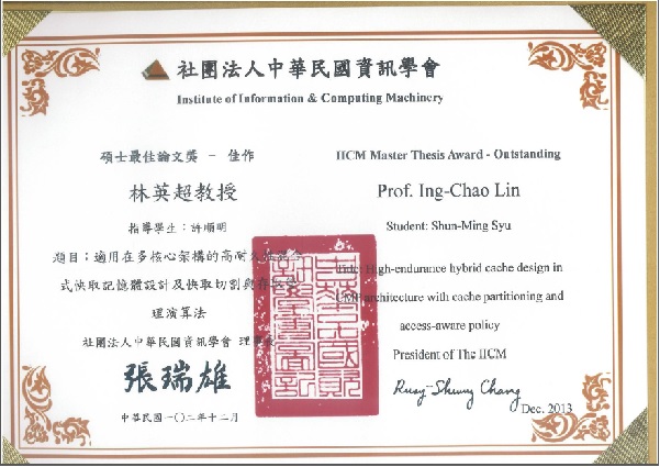 2013Oct 13IICM 碩士論文奬學生許順明 論文 "適用在多核心架構的高耐久性混合式快取記憶體設計及快取切割與存取管理演算法" 榮獲2013中華民國資訊學會最佳碩博士論文獎 佳作