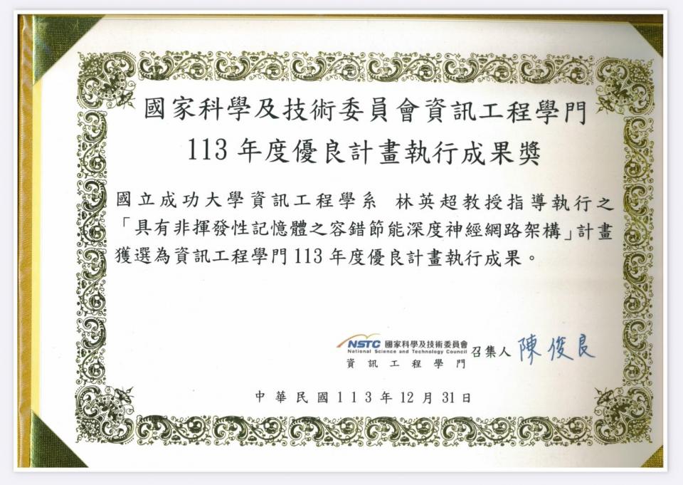 April142025計畫 "具有非揮發性記憶體之容錯節能深度神經網路架構" 獲得優良計畫執行成果獎計畫 "具有非揮發性記憶體之容錯節能深度神經網路架構" 獲得優良計畫執行成果獎