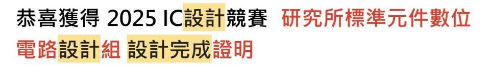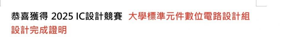 JULY282025專題生余祥任同學獲得 IC設計競賽 設計完成證明專題生余祥任同學獲得 IC設計競賽 大學部標準數位電路設計組 設計完成證明