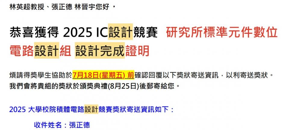 JULY282025<學生張正德 獲得 IC設計競賽 設計完成證明學生張正德 獲得 IC設計競賽 研究所標準數位電路設計組 設計完成證明