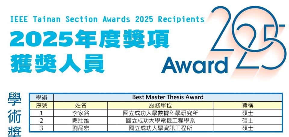 2017Nov 17獲得IEEE Tainan Section Best Master Thesis Award
